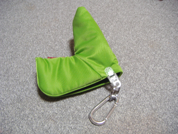 使い方はクリップ部分を常時パターカバーに挟んでおく。パット時にカバーを外してカラビナをベルト通しに差し込む。逆にパターンでベルト通しにぶら下げておいてカバーを外した時にカバーをクリップで留める方法もあるが、いくらワンタッチクリップを使ってもこっちは面倒。