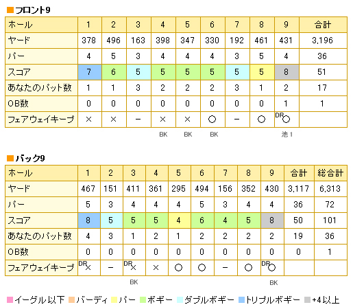 イン最終でも、ドライバーショットが240ヤードを先の絶好の位置。グリーンエッジまで170ヤード。ここは悪くてもボギーと考えていたので、グリーン手前の大きなバンカーたちが気になりつつUT25度で強振。案の定グリーン手前の土手にあたってバンカーに落下。なんとそこから4回も打つことになってしまった。これはもう笑ってしまった(笑)。