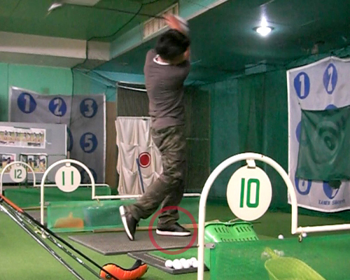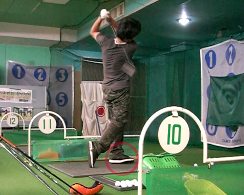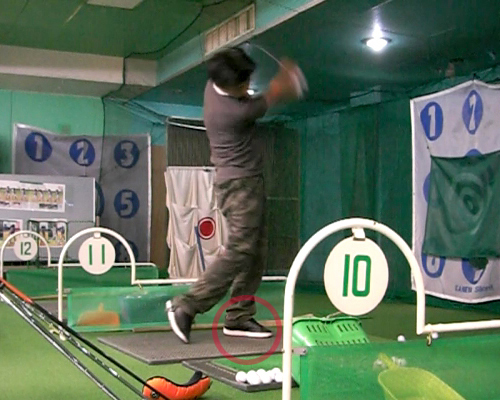 しかし、今日のスイング撮影であることを発見。久しぶりに正面側から撮影してみたのだけど以前よりガニ股がひどくなっていた。それは左つま先と左膝。フィニッシュで左つま先が開いてしまうのは膝をかばうための身体の自然な動きだが、ダウンスイング時点ですでに左つま先が開いてしまい、同時に左膝も開いてしまっている始末。