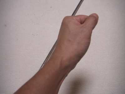 インパクト以降は肘と甲は直線が理想。「外に折れなけりゃいいんだろう」としか考えてなかったところにある発見が…。普通の状態ではすでに外側に角度がついてしまっているという簡単な事実。意識的に内側に持ってこないと直線にはならない。当然ながら思いがけない盲点。