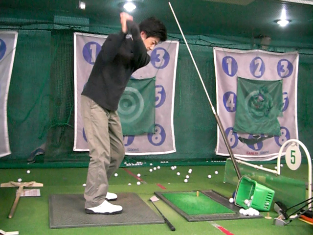 これでボールを打つドリルなのだけれど、最初はヘッドがどこを走っているのか全く解らずボールにも全然当たらない。悔しいので何度も何度も素振りを延々と繰り返すこと数分。やっとコツが摑めてきた。ボディーターンを使ってクラブのしなりを充分に利用して、インパクトでは逆にしなるのを待ちつつヘッドを走らせる。