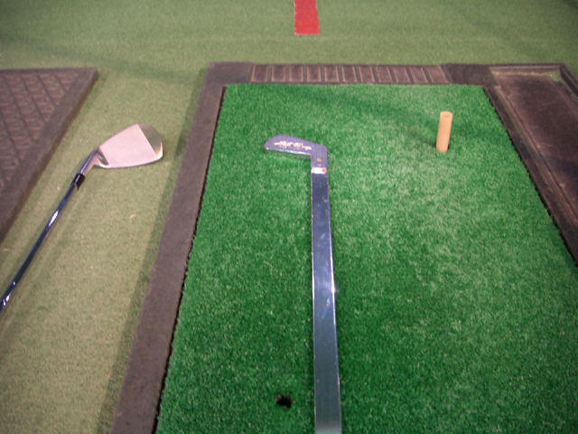 身体全体がヘッドを待てずに突っ込んでしまう癖。グリップ、左足、右肩全てが突っ込み気味。左脇を胸前に締めてインパクトする、左足の内側に重心を置いてインパクトするなどいくつかの修正点を指摘され、そして最後にこの器具が登場。平べったいアイアン型の練習クラブ。