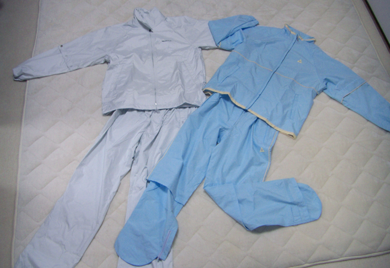 写真右が私のレインウェアで処分セール買ったミズノの安物。右側が奥さんのでルコックの結構高価なレインウェア。両方とも1度も使用していない。我が夫婦は都合が良いことに、サイズが全く同じなのでどちらを持って行っても大丈夫。だけど、自分が右の水色を着るとどこかの「清掃員」みたいになってしまったので自分のを持って行く(笑)。