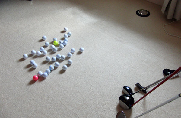 最後に床に敷いた芝生状のマットをどけて、フローリング風クロスの床から直接打ってみた。微塵もダフれない恐怖感。ボールコンタクト後に床にトン!とクラブが触れる感じになるようにと続ける。少しでも手前の床を擦ってしまうとフェースの向きが変わってあらぬ方向へ。これはいい練習になるかもしれない。今後も練習に組み込もう。