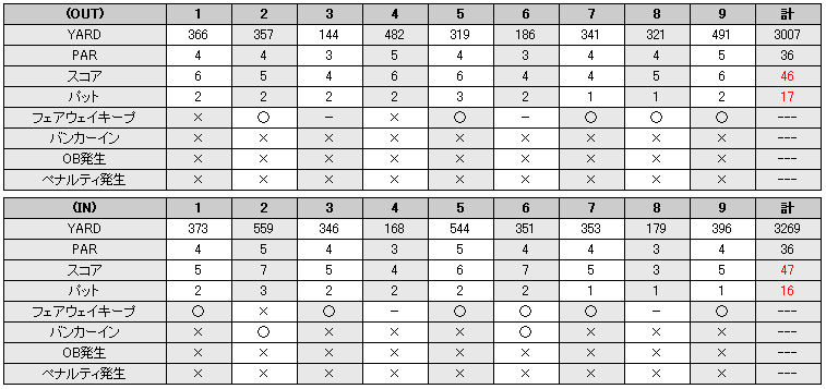 とにかくスライスした1日だった。まぁ、間違っても左に曲がることはなかったので、狙いは定めやすかった。ただ、こんなに大きなスライスを打っていては飛距離は稼げず、ドライバーショットは全て200Y未満。この厳しい現実を受け入れながらのラウンドに…。グリーンを狙う時も、スライス覚悟で打たねばならず、パーオンなしの1日となった。