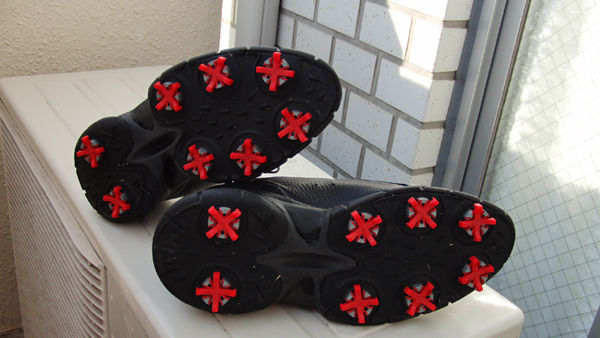 前に奥さんのスパイクの鋲交換をした時は、付録で付いていたような簡単な金具でやったせいか結構難しく感じたけれど、今回はちゃんとした工具を買ったのでとても簡単に着脱できた。ラウンド後に、エアコンプレッサーでよくシューシューやるが、こうして鋲交換する時のためにも念入りに手入れしておくことが大事みたい。