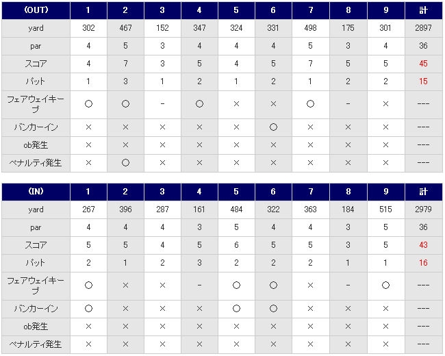 日々の素振りで左手首を痛めてラウンド前日に通院。スイングの動きでは痛まないが引き戸を引く等の力の入れ方で痛む。当日もスタート前に50球ほど打ったが、打っているうちに忘れてしまったほど。早めに着いたのでアプローチ&バンカー練習もみっちりできた。