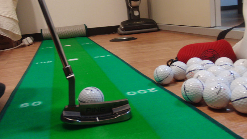 自分が自宅で行う練習は、パッティング用マットの片方を丸めてそこにめがけてぶつけるように転がすもの。1.5mを集中的に行い、10mくらいの振り幅まで行う。大きな振り幅の時も50cm、1m先の中央のライン上を必ずボールが通るようにする。もちろんリズム&テンポ厳守。