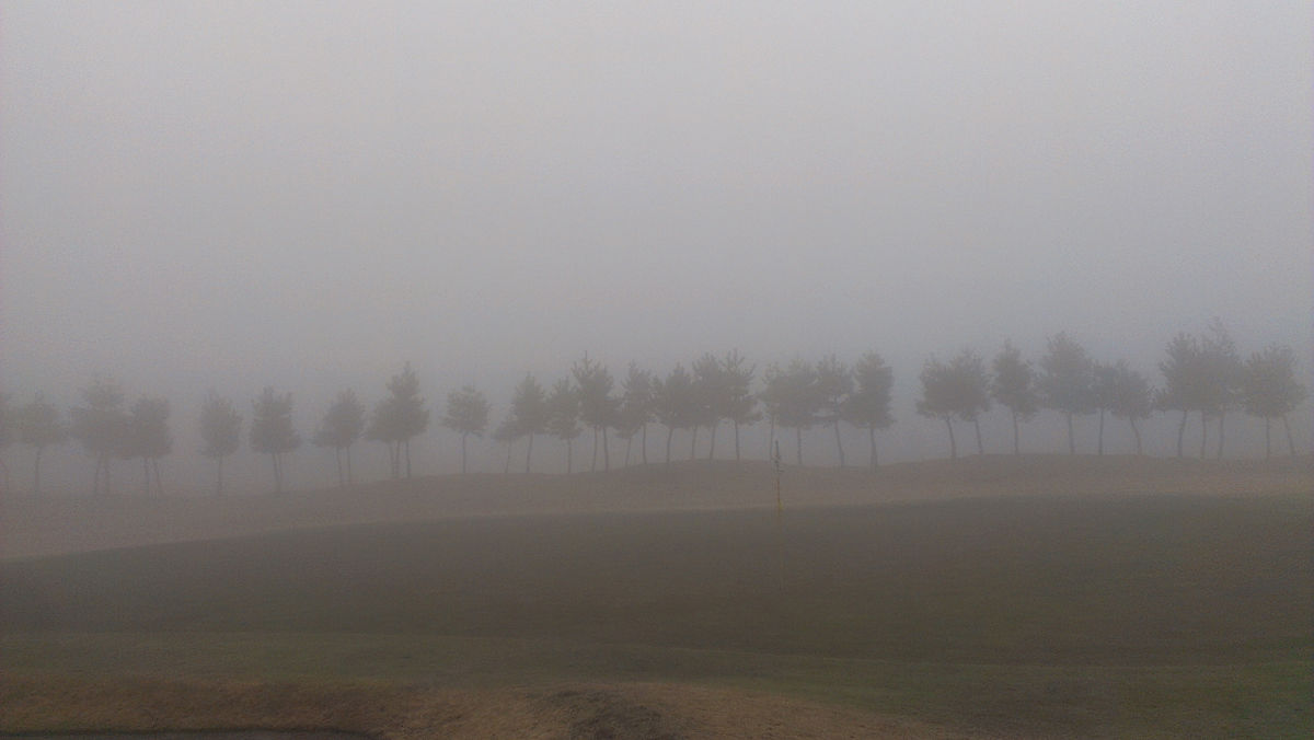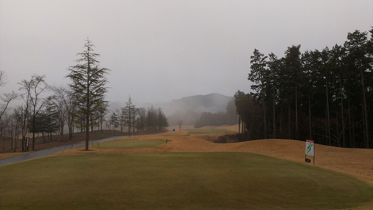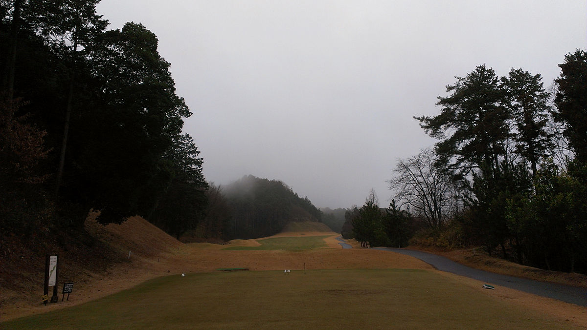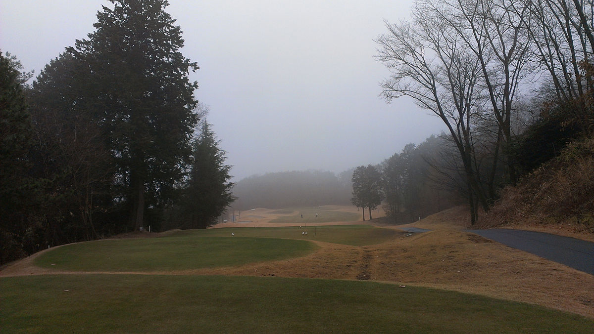 現地に着くと雨ではなく霧。しかもこの霧は晴れるどころかどんどん濃くなって結局ゴルフ場側の判断で30分遅れでスタート。上の写真は大きく打ち下ろすインコースのスタートホールの様子。