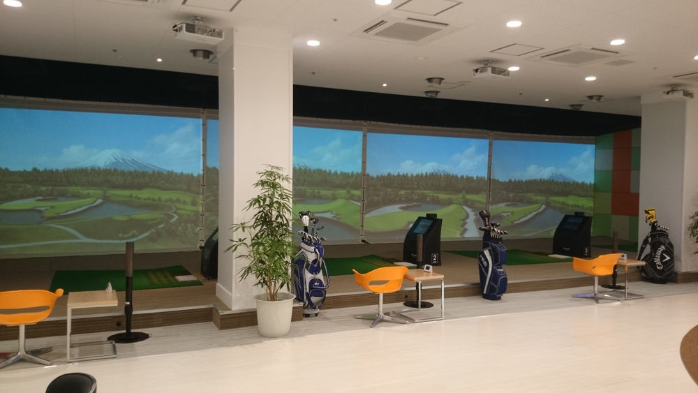 この室内練習場のカウンター左奥にチップゴルフはある。全く関係ないけどさらに奥には日焼けサロンもあったりする。