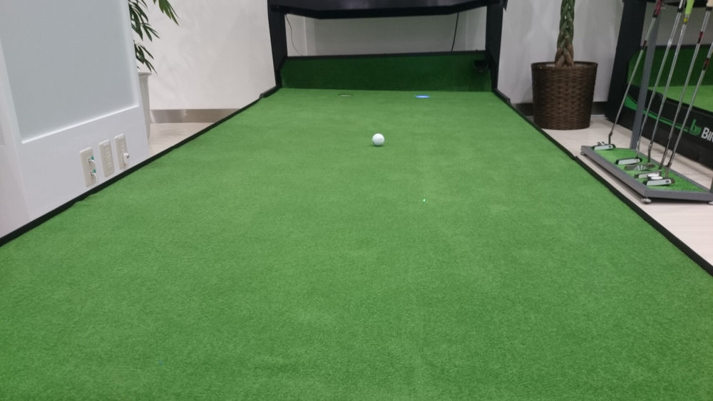 私が行っている「練習になりそうな内容」としては、まずマシンを軌道させず、傾斜なしの状態で1m〜2mを練習。自宅用マットと違って平坦なままカップにボールが沈められるのはいい。横幅がせまいカップ付きのマットより確実に緊張感があるし、平坦なので本物っぽい。