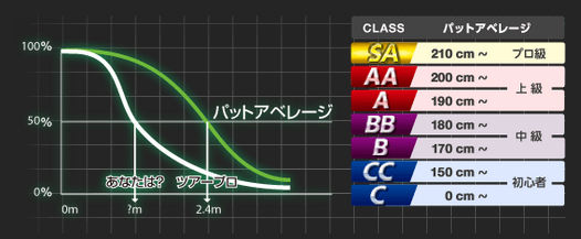 ここでのパットアベレージとは、プレーヤーが50%以上カップインする距離のこと。ちなみに今現在の私のアベレージは154cmで、クラス分けとしては「CC(初心者)」で実質的に最低のレベル(泣)。